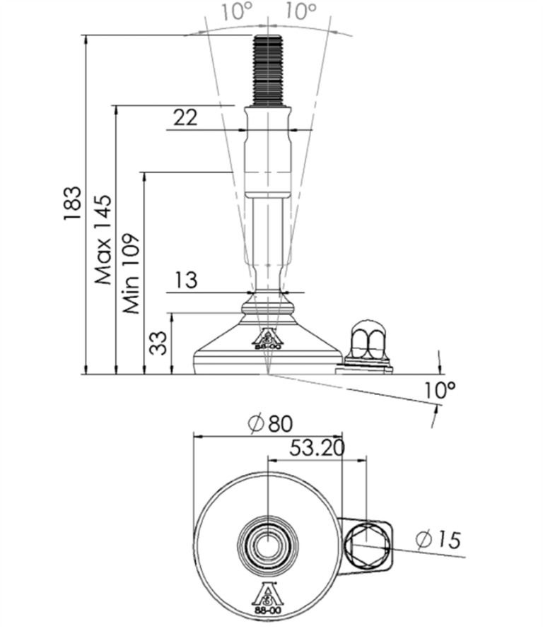De hygiënische stelvoet bevat een huls dat de blootliggende schroefdraad bedekt en als contramoer fungeert.
